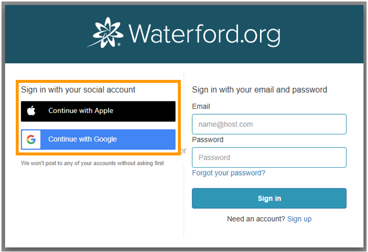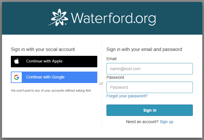Before you can view your students’ progress, you must first create a Waterford Family account. You can create a Waterford account with your email address or associate a new account with your Apple ID or Google account.