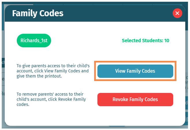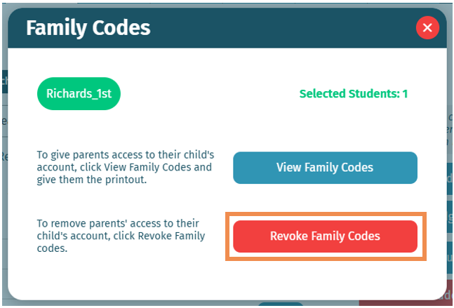 - Select Family Codes. This will open a pop-up window with two options: View Family Codes and Revoke Family Codes.
