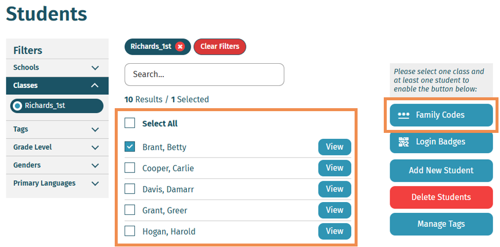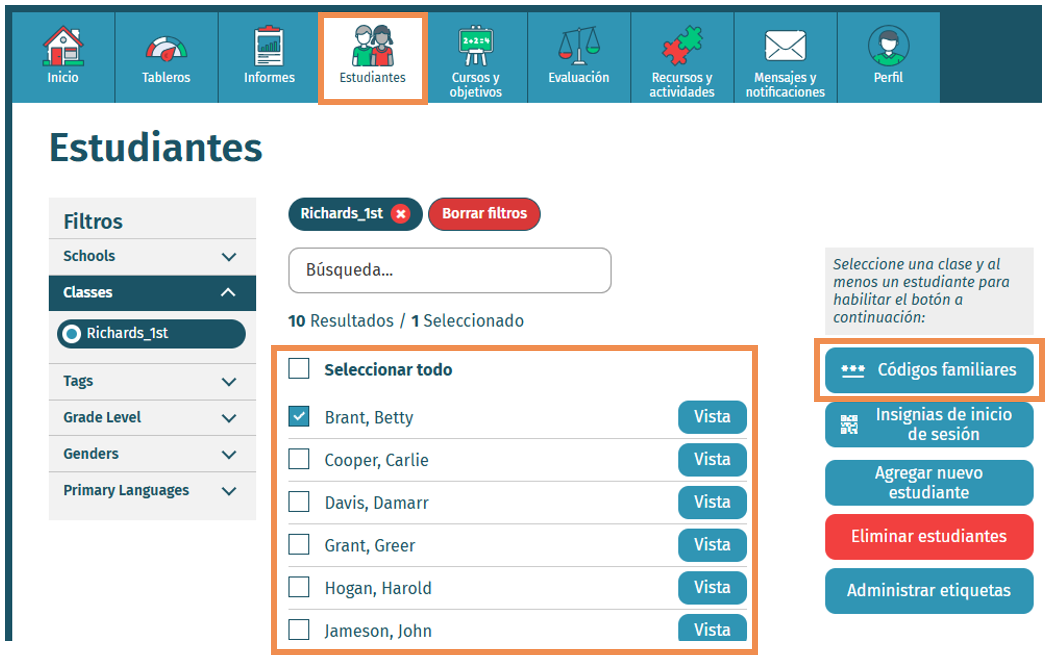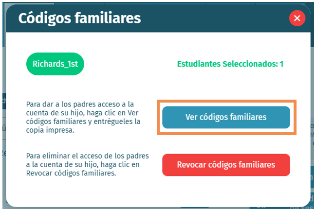 - Check the box to the right of the student(s) whose Family codes you would like to download in Spanish.