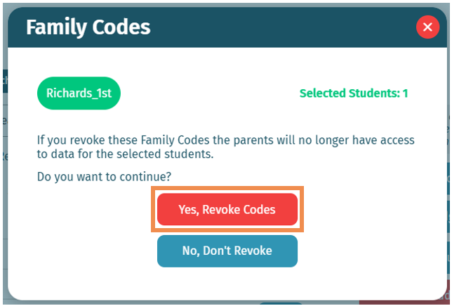 - Check the box next to the name of the student whose Family code you would like to revoke.