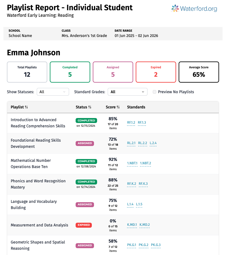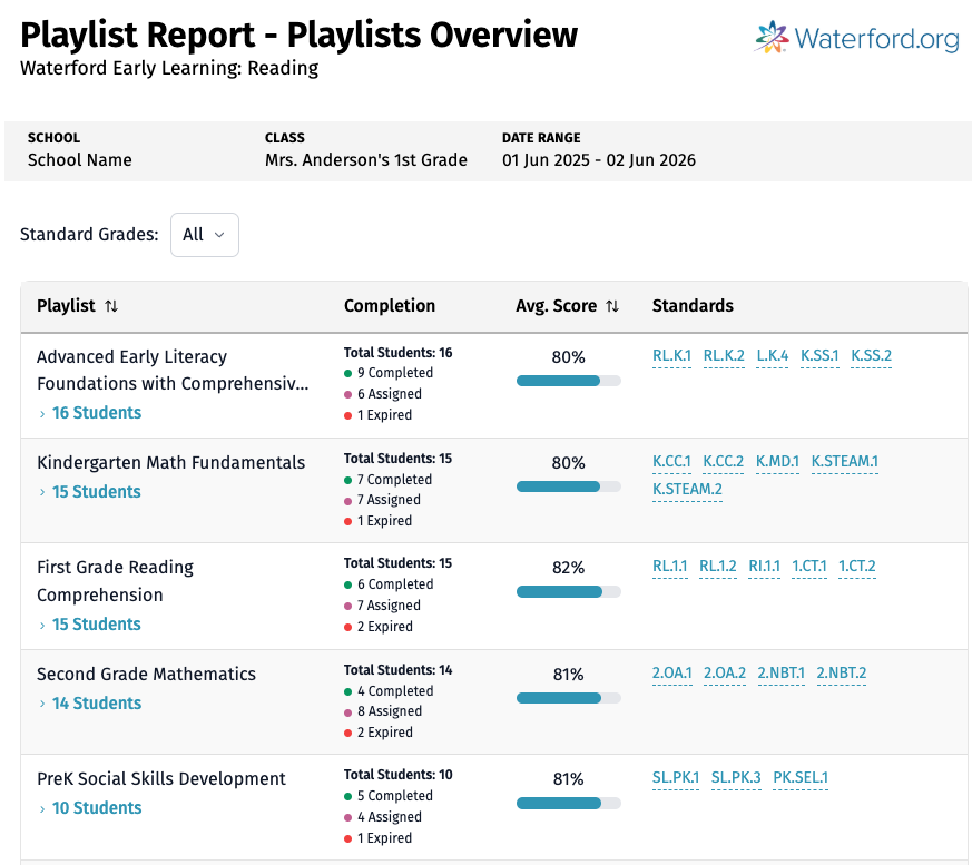 Educators can now see completion and score information for the playlists they assign to individual students. This new report provides visibility into student progress on assigned playlists, helping educators understand which activities have been completed and how students performed. Where applicable, the report displays standards alignment for Early Reading Program (ERP) activities.