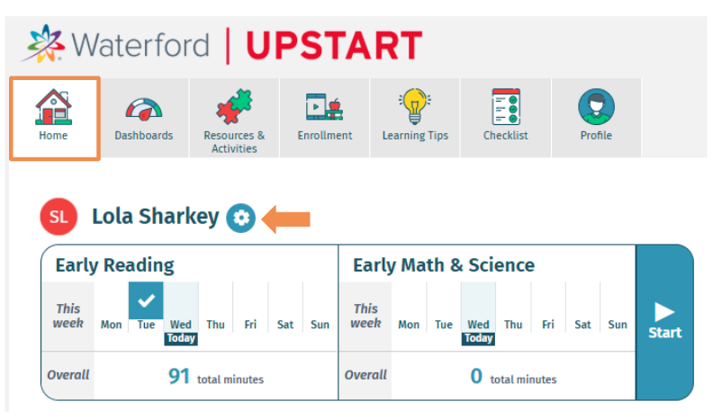 - On the Home tab, click the settings gear icon next to your child’s name.