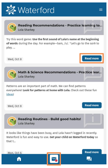 Messages are sent on Monday, Wednesday, and Friday of each week and will highlight routines, ideas for practicing skills at home, and links to learning resources. Select Read More to view the entire message. The messages are view only; you are not able to respond.
