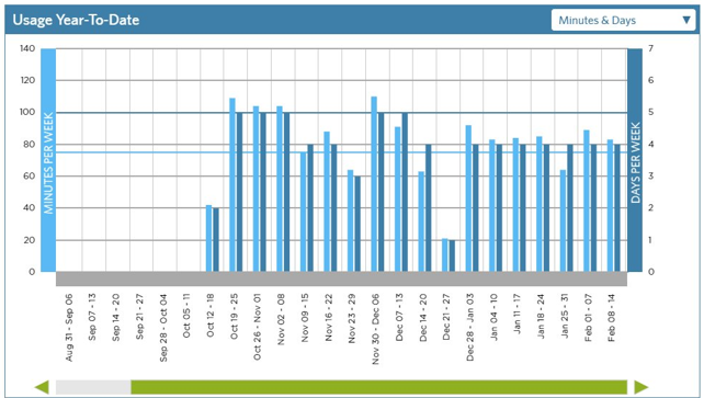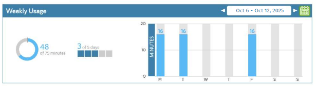 This section displays a summary of the minutes and days your student used the program per week throughout the school year compared to their usage goals. The information in this section is updated nightly.