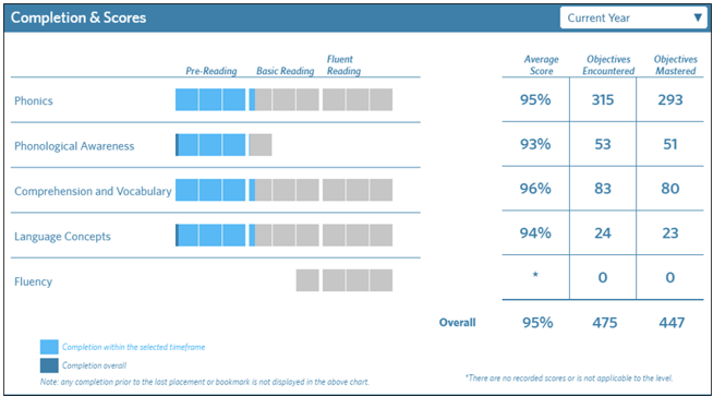Waterford Family dashboards can be filtered by individual child and display the following information for your student: