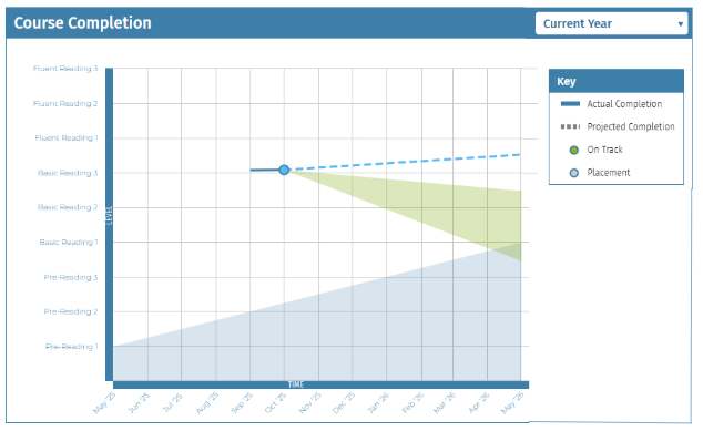 This section displays the level goal progress for the student based on their starting location. You can view either the Current Year or Total Progress. The information in this section is updated on Monday every two weeks.