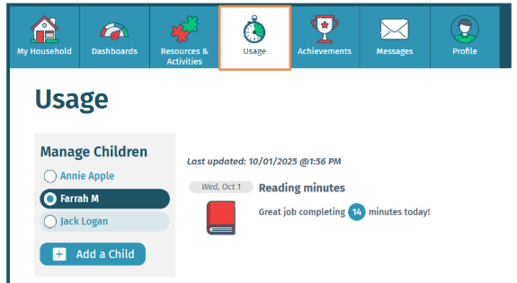 The Usage tab allows you to track usage data. The information on this tab can be filtered by child if you have multiple students connected to your account.